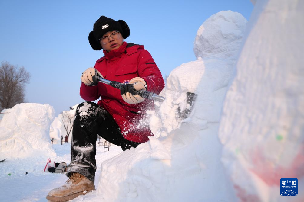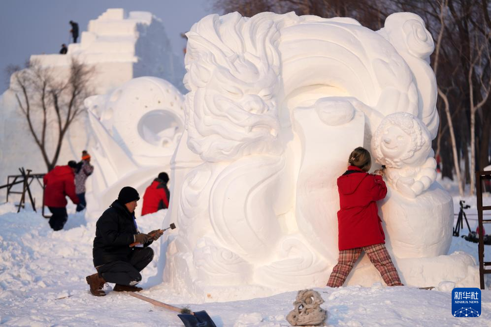 12月28日,在太阳岛雪博会园区,第三十届全国雪雕比赛参赛选手在进行雪雕创作。