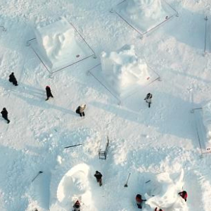12月28日,在太阳岛雪博会园区,第三十届全国雪雕比赛参赛选手在进行雪雕创作(无人机照片)。