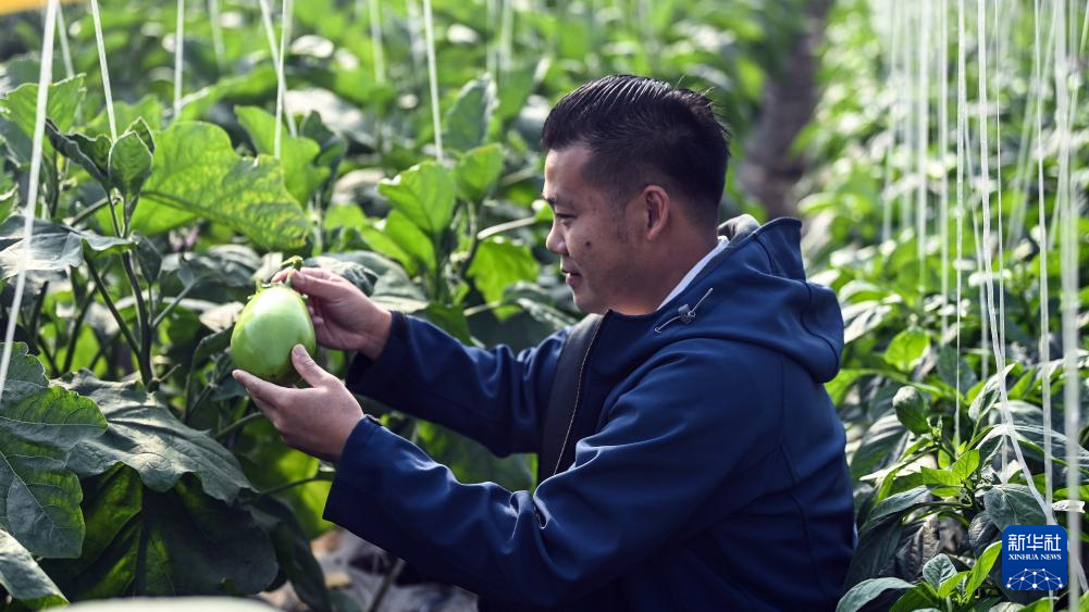 12月27日,在合浦县沙岗镇一家农业公司的智能大棚内,农业技术员查看茄子长势。