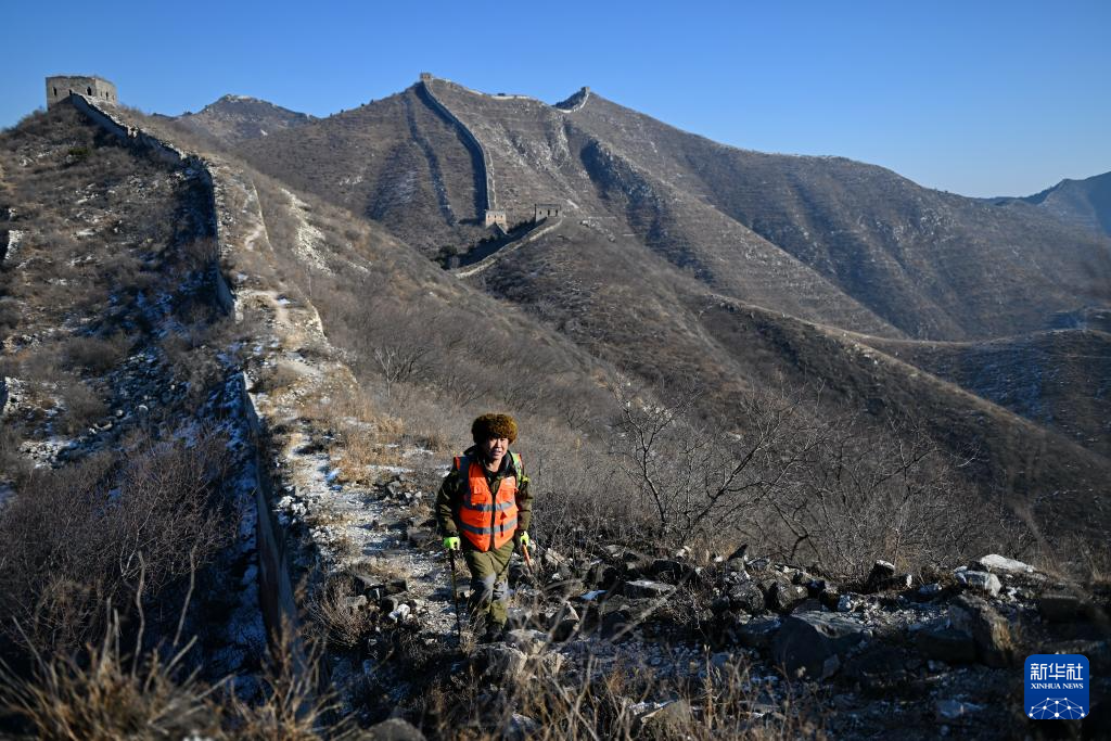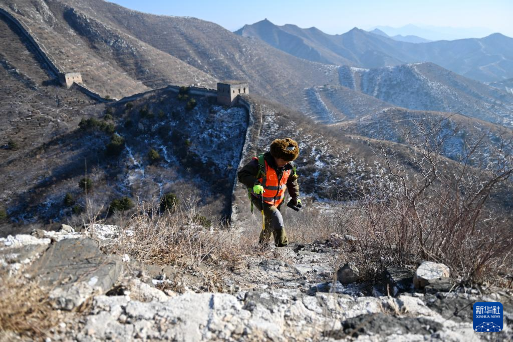 临近隆冬,河北省迁安市建昌营镇大龙庙村57岁长城保护员孟祥宝像往常一样,一大早就收拾装备,开始了巡查长城的工作。孟祥宝2016年正式成为一名长城保护员,负责守护的长城共2.5公里,其中有7座敌楼,每周要巡查四五次。“只要是雨雪天气,我都要上山来转一转,发现险情要立刻上报。”孟祥宝说。自幼生活在长城脚下,长城敌楼、烽火台、墙垛都是孟祥宝儿时的“玩伴”,长城保护员的工作虽然艰苦,但他乐在其中:“这段长城‘建’在了我的心里,它们每天有啥变化,我都有数。”