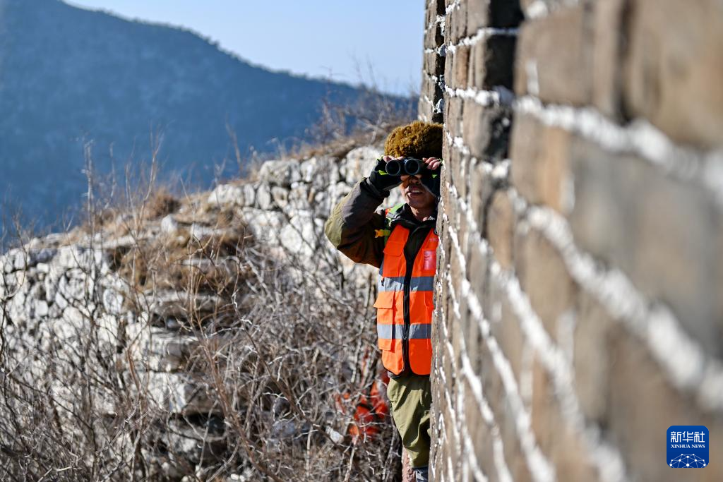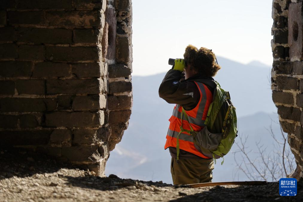 12月28日,孟祥宝在长城一座敌楼前使用望远镜瞭望。