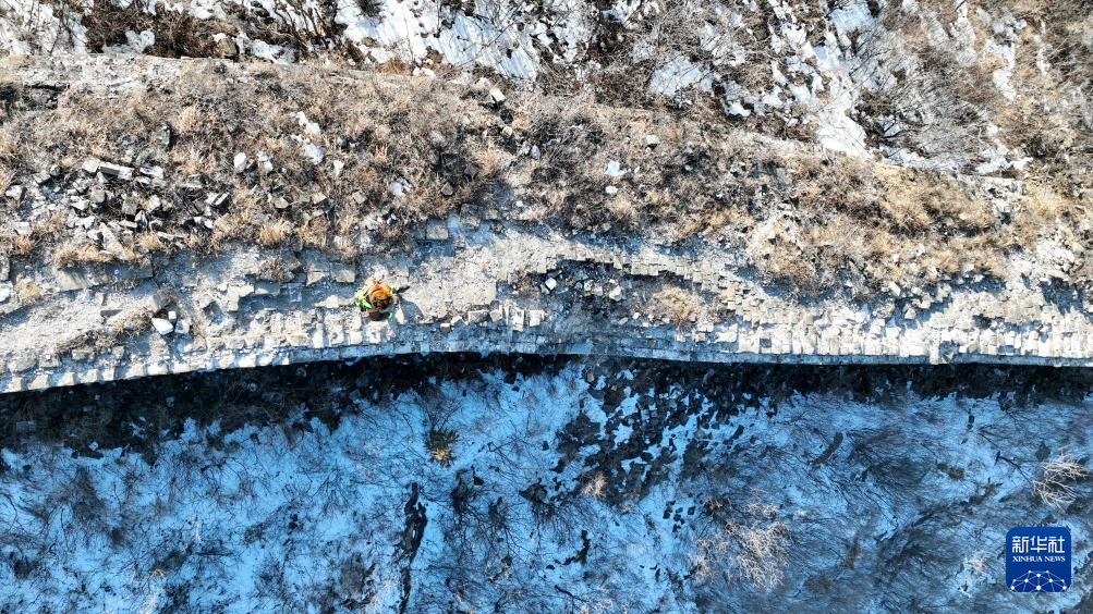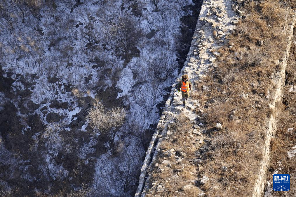 12月28日,孟祥宝在巡查长城途中(无人机照片)。