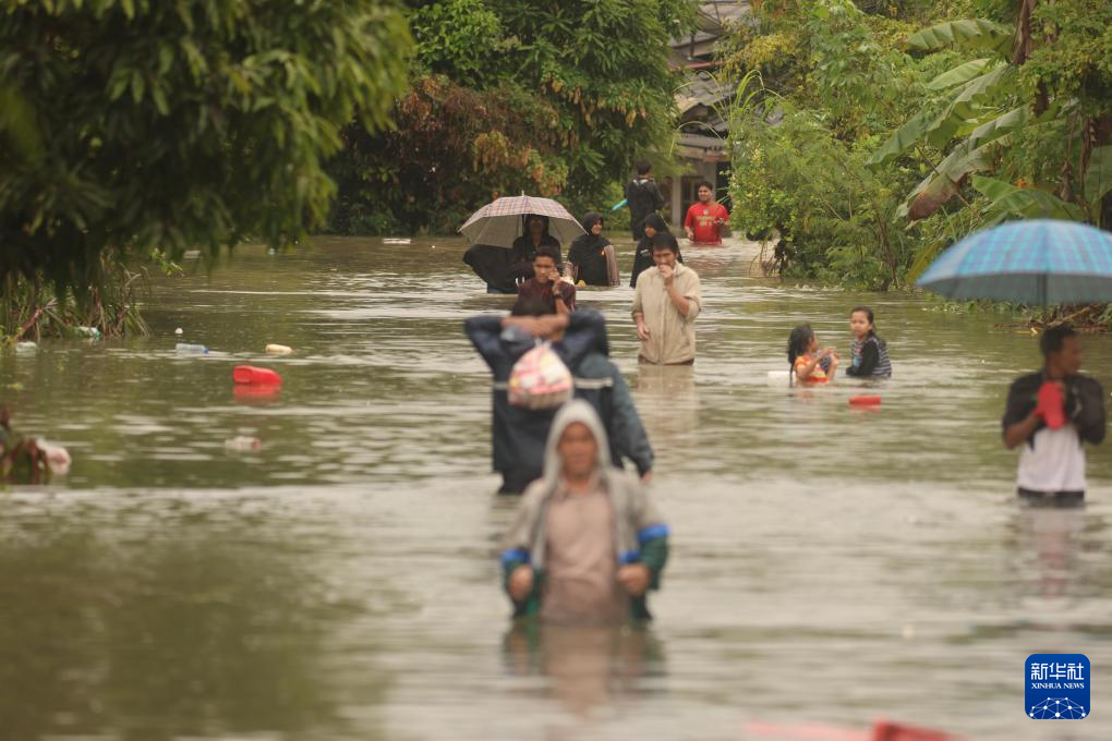 12月25日,在泰国那拉提瓦府,人们在被水淹没的道路上涉水前行。