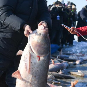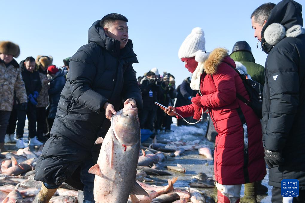 12月28日,在查干湖冰面上,游客挑选刚打捞上来的查干湖鱼。