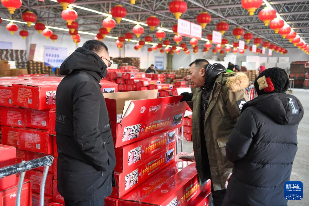 12月27日,在查干湖渔场超市,工作人员搬运查干湖鱼(无人机照片)。