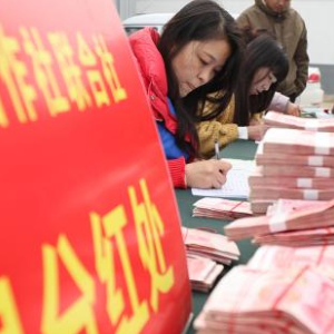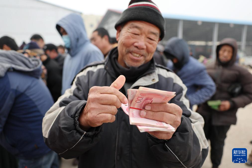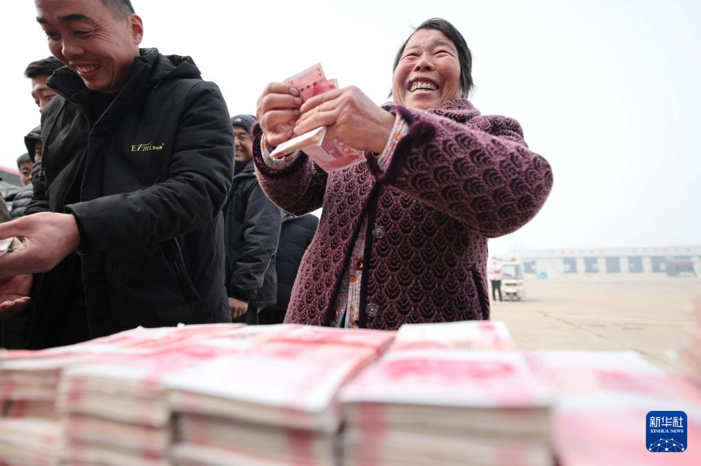 12月28日,在山东省临沂市沂南县苏村镇蔬香瓜田蔬菜种植农民专业合作社联合社分红大会上,农民领到分红后数钱。