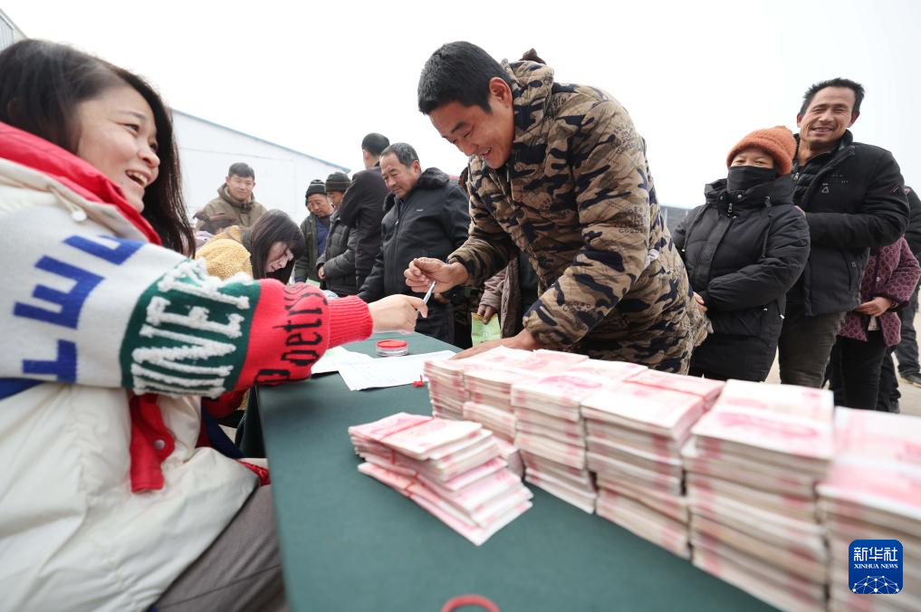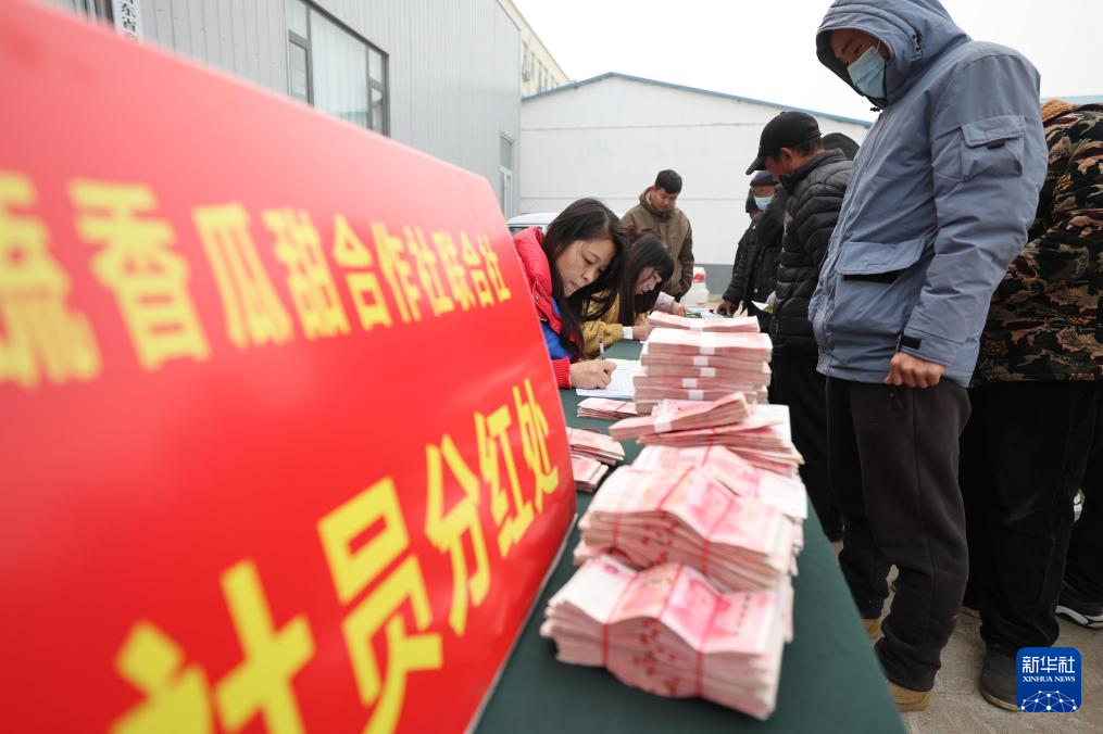 12月28日,农民在山东省临沂市沂南县苏村镇蔬香瓜田蔬菜种植农民专业合作社联合社分红大会上领取分红。