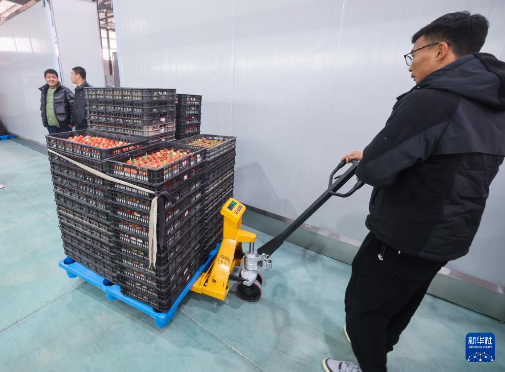 12月29日,在建德市杨村桥镇的草莓市场的分拣中心内,工作人员搬运早上刚刚采摘的草莓。