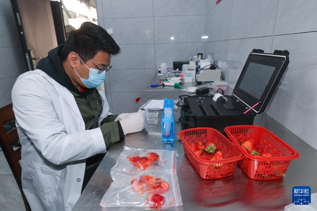 12月29日,在建德市杨村桥镇的草莓市场的检测中心,工作人员对草莓进行食品安全检测。