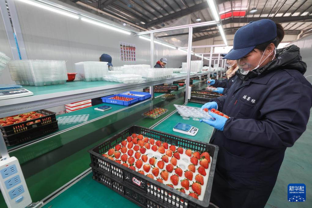 12月29日,在建德市杨村桥镇的草莓市场的分拣中心内,工作人员分拣不同等级的草莓。