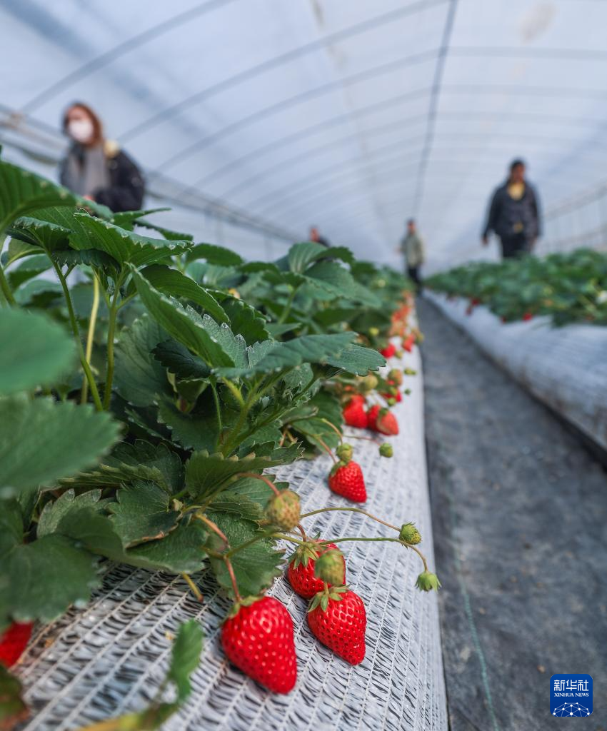 12月29日,游客在建德市杨村桥镇的草莓种植大棚内采摘草莓。