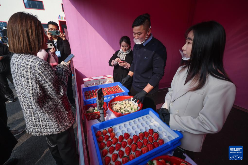 12月29日,在建德市杨村桥镇开幕的草莓节的共富集市上,种植户在销售新品种草莓。