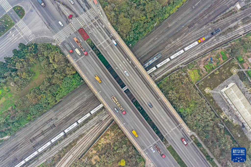 12月29日,陆海新通道中老泰跨境铁路双向班列(中国重庆—老挝万象—泰国曼谷)从一座公路桥下穿过(无人机照片)。