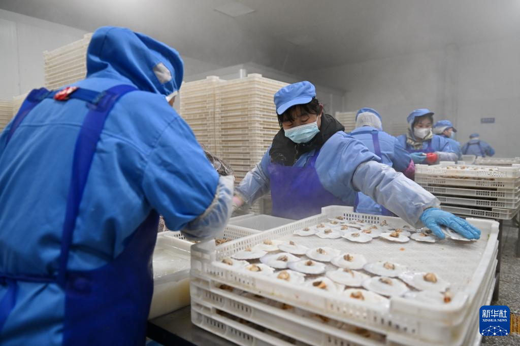 12月29日,河北省滦州市前明碑村一家海产品加工企业的工人在加工扇贝。