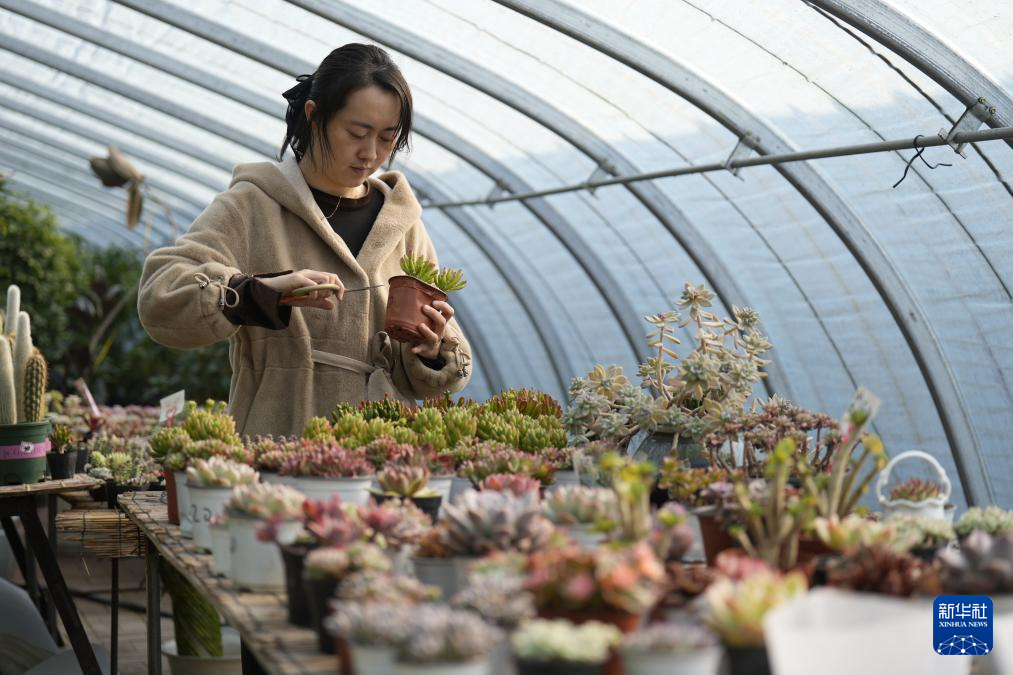 12月29日,河北省滦州市张坎村一处花卉种植基地的花农在养护多肉植物。