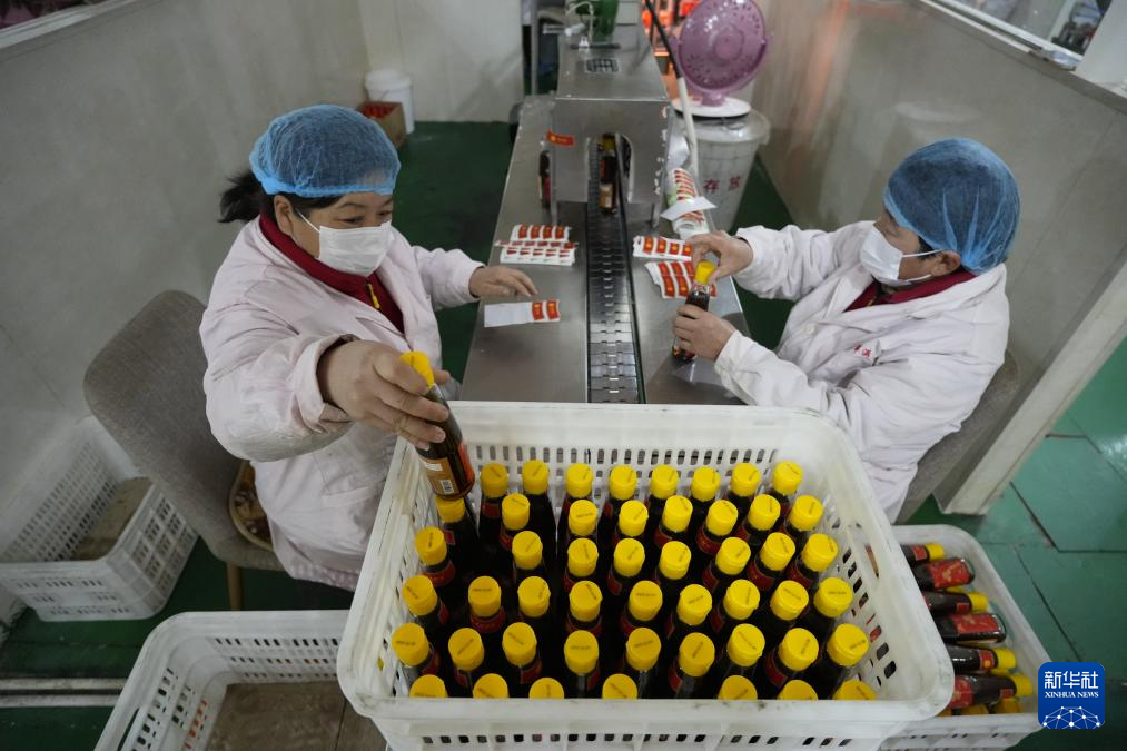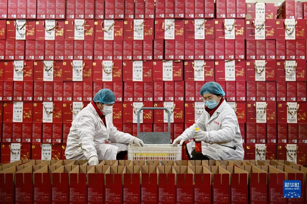 12月29日,河北省滦州市邸庄村一家香油生产企业的工人在包装产品。