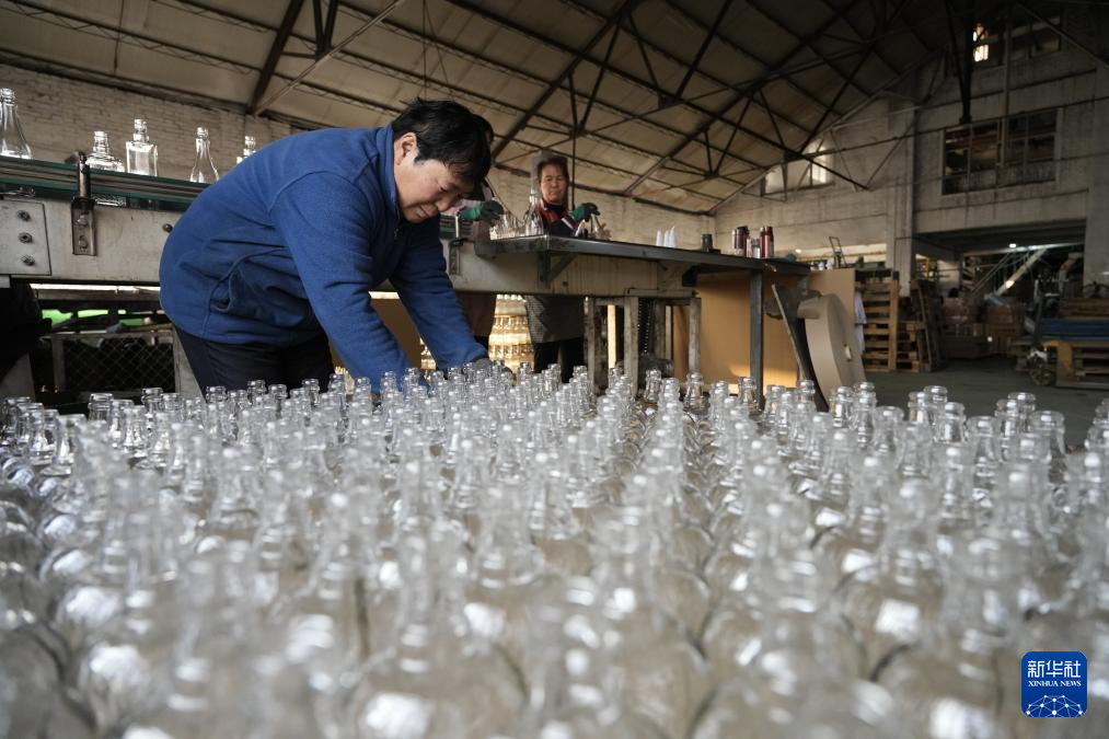 12月29日,河北省滦州市后明碑村一家制瓶企业的工人在整理玻璃瓶产品。