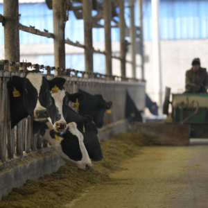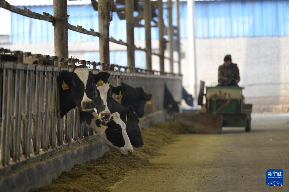 12月29日,河北省滦州市范庄村奶牛场的工人在整理奶牛饲料。