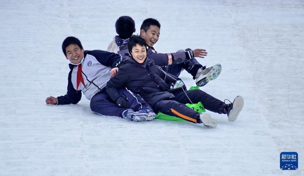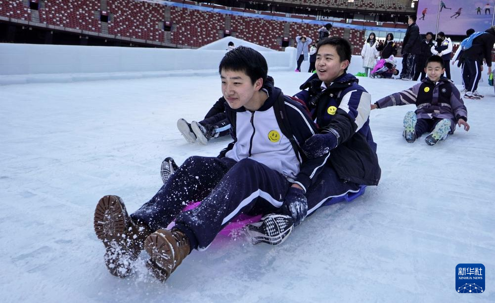 12月29日,学生们在“鸟巢”欢乐冰雪季上玩耍。