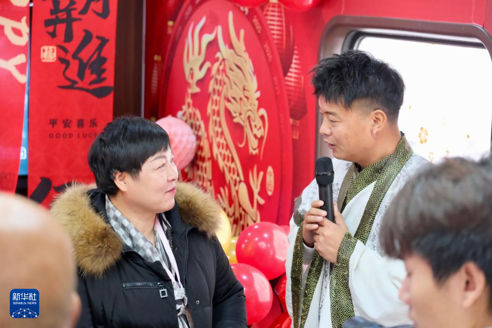 12月30日,游客在首趟环秦岭跨年主题旅游专列上参与趣味知识问答。本趟列车搭乘300多名旅客,将途经西安、安康、汉中等城市。