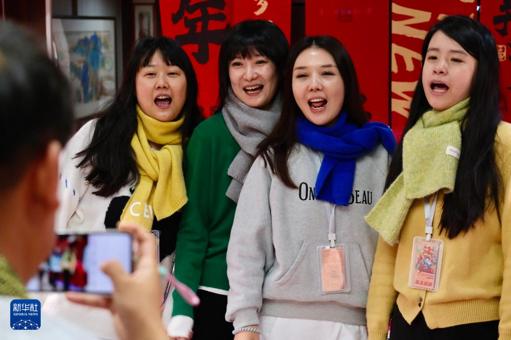 12月30日,在河北省石家庄市新华区开展的“体验非遗迎新年”活动上,蔚县剪纸艺人周淑英在工作室给学生介绍剪纸作品。