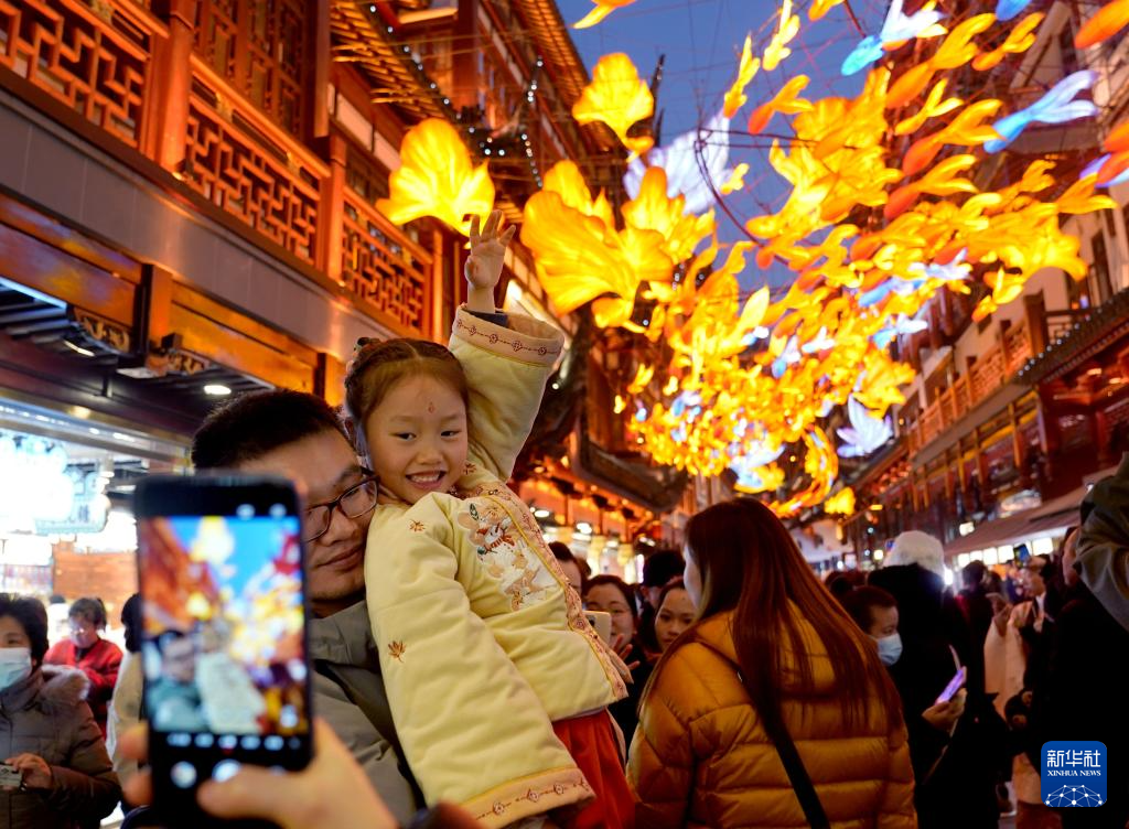12月30日在上海豫园商城拍摄的“一夜鱼龙舞”主题灯组与观灯人潮。