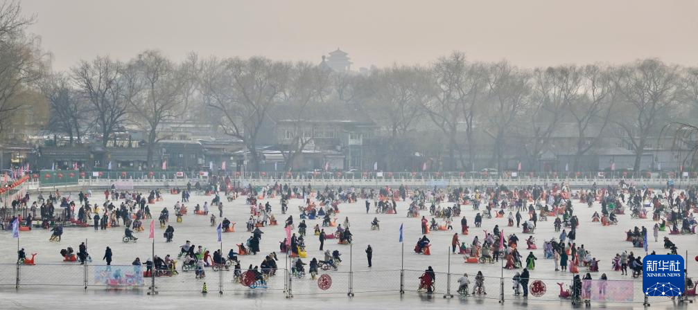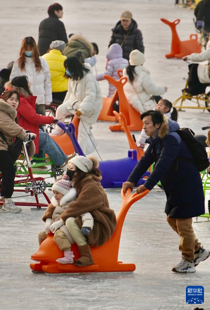 12月30日,游人在北京什刹海冰场体验冰上运动。