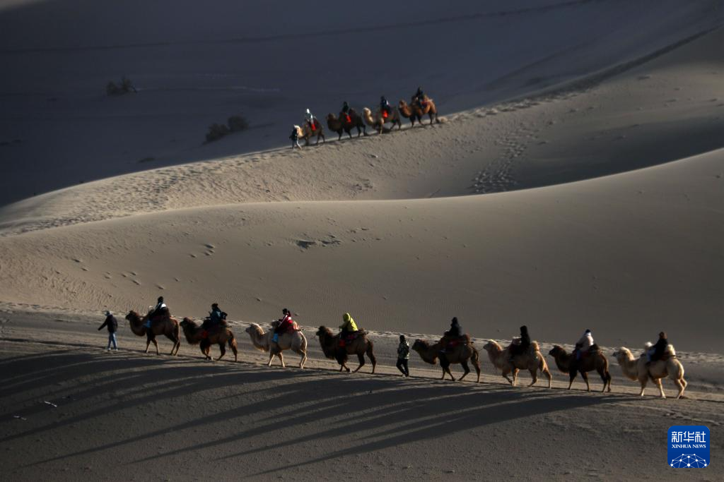 12月30日,游客在甘肃省敦煌市鸣沙山月牙泉景区游览。