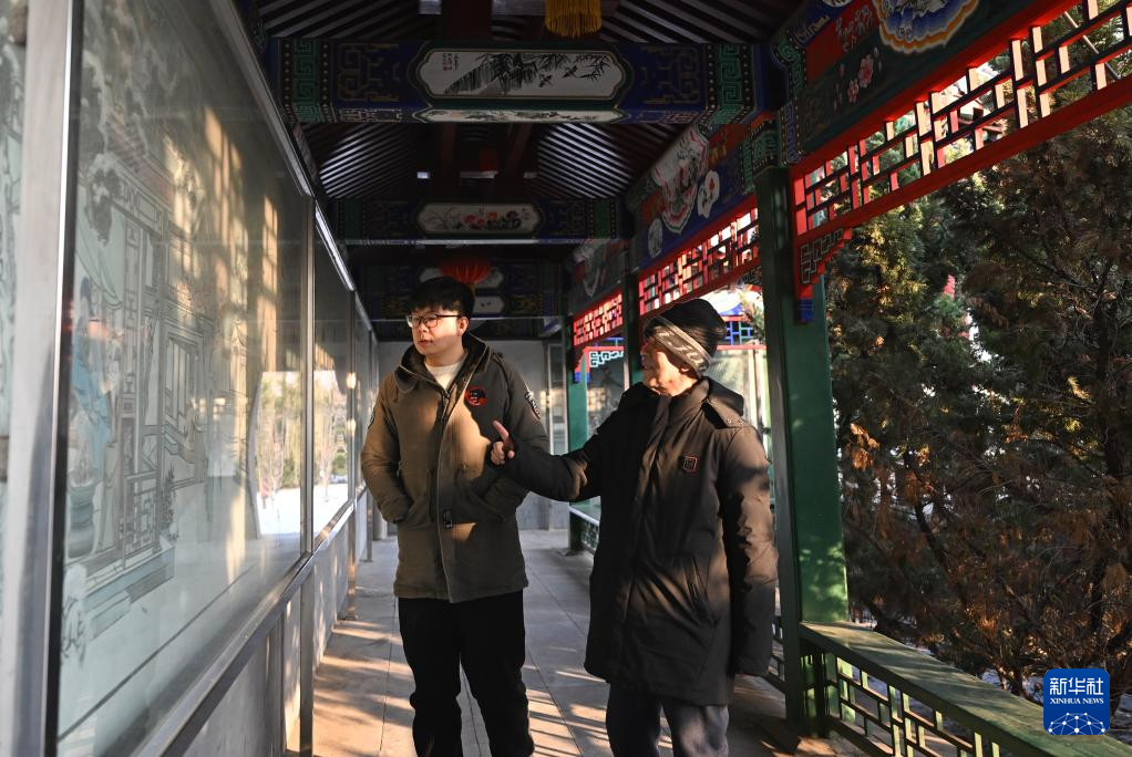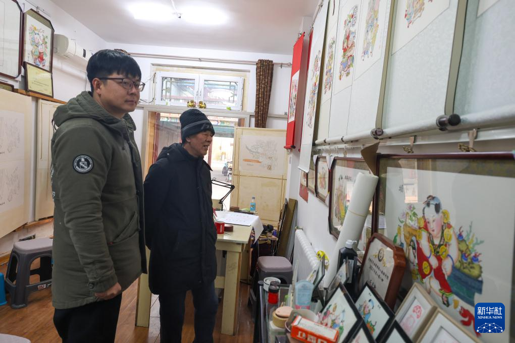 在天津市西青区杨柳青镇,郗旺(左)与师父王文达来到一个画室内参观(12月27日摄)。
