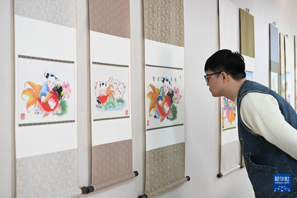 在天津杨柳青画社,郗旺在一幅“连年有余”年画前驻足(12月26日摄)。