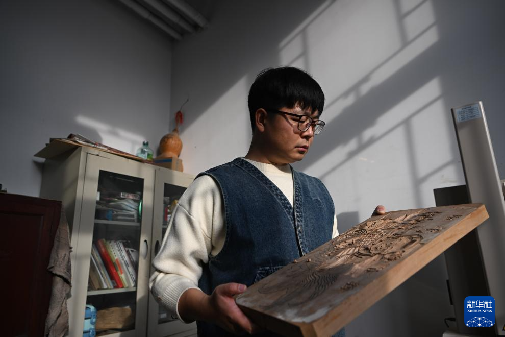 在天津杨柳青画社,郗旺拿起雕刻好的年画木版检查细节(12月26日摄)。