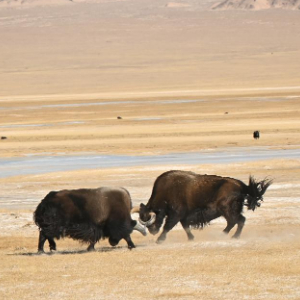 在阿尔金山国家级自然保护区,两只野牦牛在打斗(12月23日摄)。