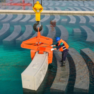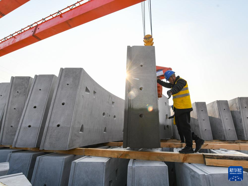 12月30日,在成渝中线高铁青白江管片厂,中铁十一局的工人将吊出水养池的管片入堆场。