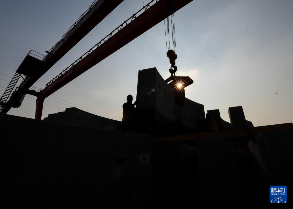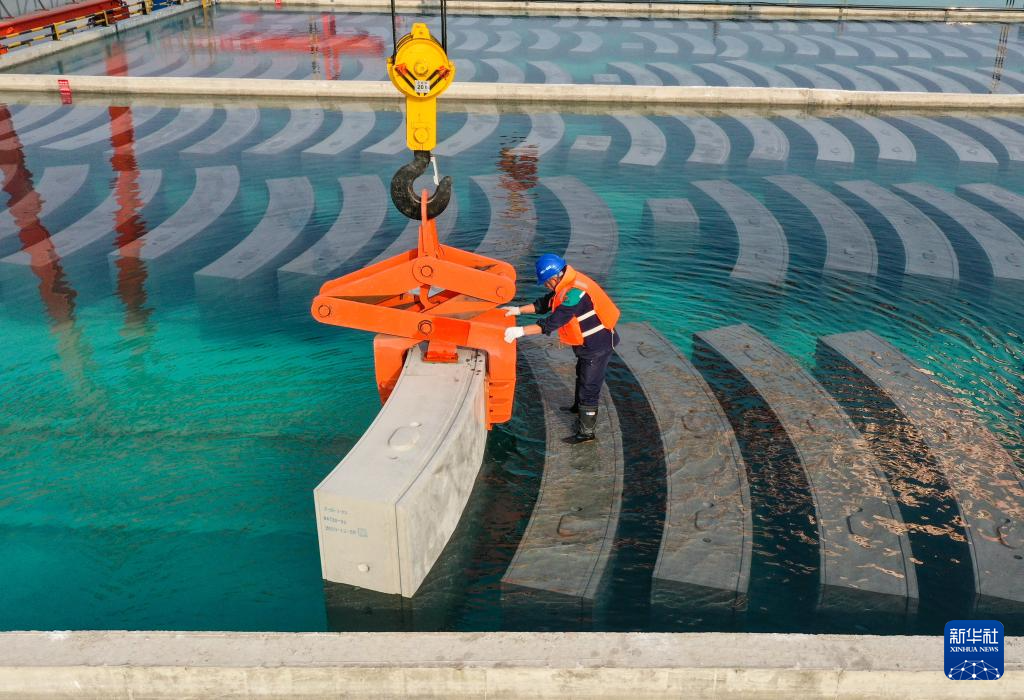 12月30日,在成渝中线高铁青白江管片厂,中铁十一局的工人将管片辅助吊入水养池(无人机照片)。