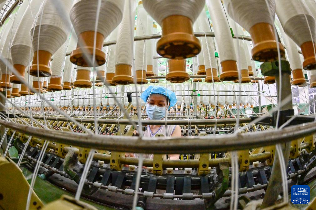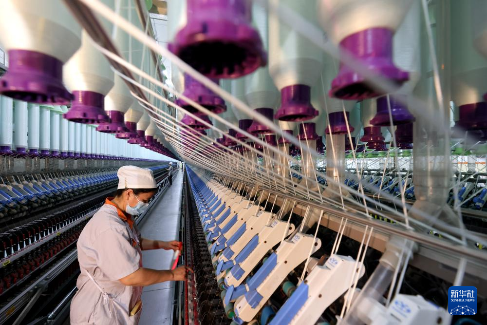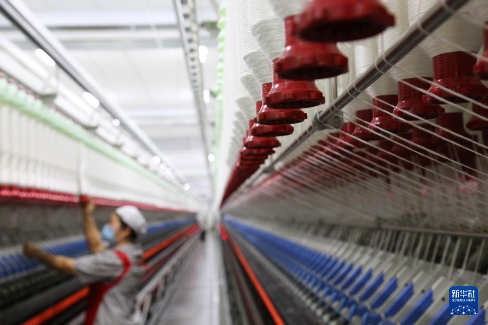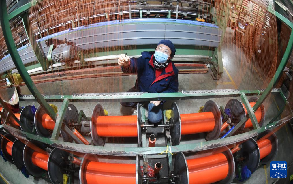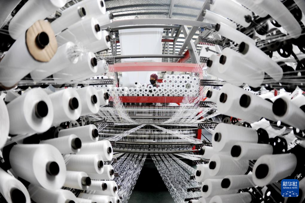 12月30日,在山东枣庄经济开发区,工人在加工高端纱线。