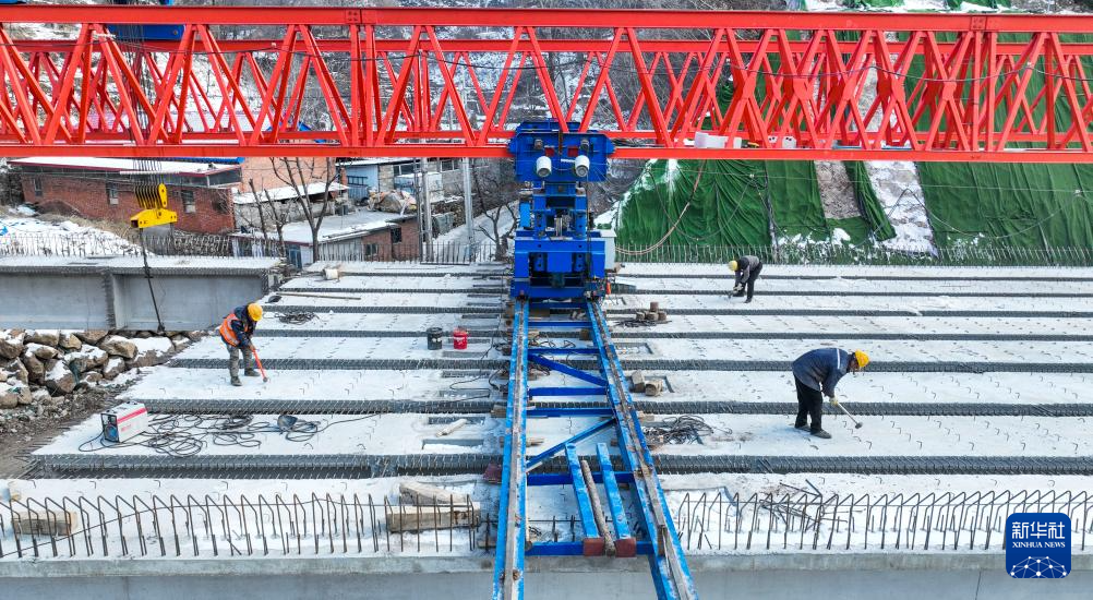 12月30日,工人在首都地区环线高速承平段兴隆县境内一处高架桥施工(无人机照片)。