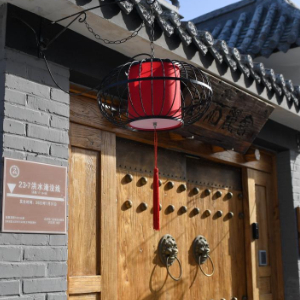 在北京市门头沟区王平镇韭园村,一家恢复营业的民宿门前挂着标有受灾时洪水淹没线的标牌(12月7日摄)。
