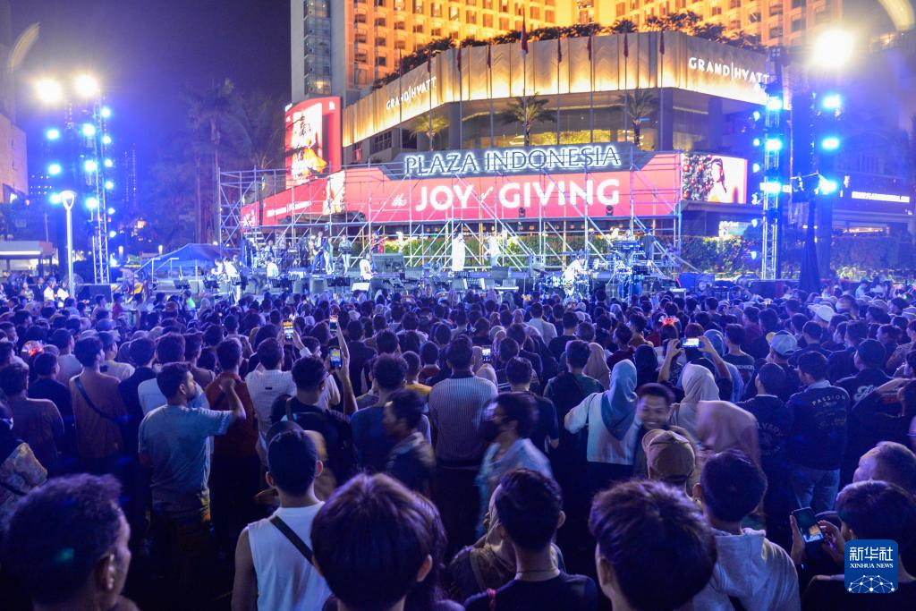2023年12月31日晚,在印度尼西亚雅加达苏迪曼大街,人们观看迎新年演出。
