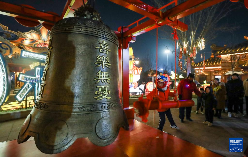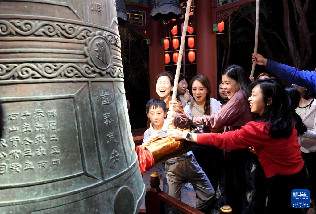2023年12月31日,游客在江苏省淮安市西游乐园撞钟祈福。