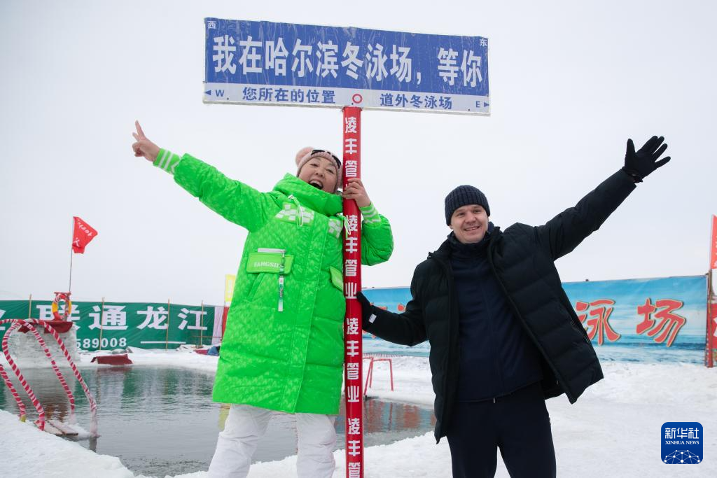 1月1日,冬泳爱好者在黑龙江哈尔滨道外游泳场外拍照留念。