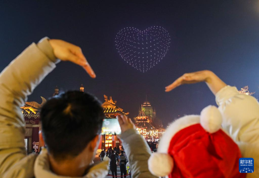1月1日,游客在黑龙江哈尔滨太阳岛雪博会园区内游玩(无人机照片)。