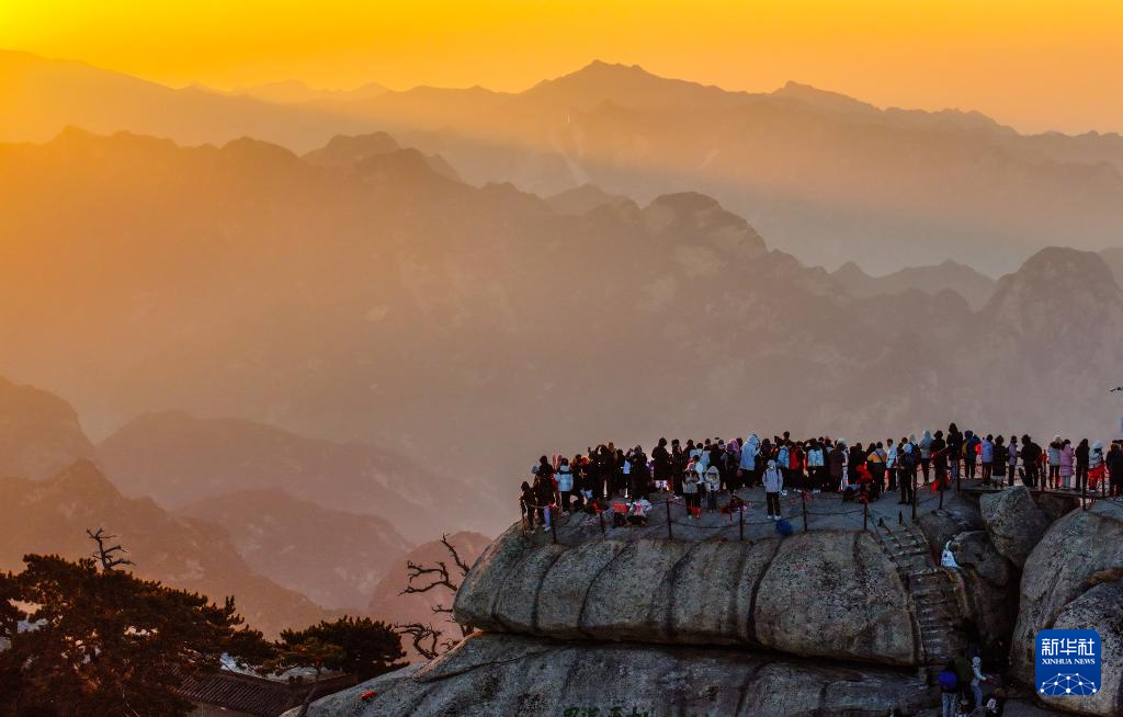 2023年12月31日,游客在位于陕西省渭南市的华山西峰赏景(无人机照片)。