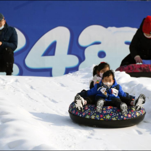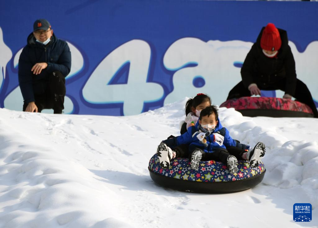 1月1日,小朋友在北京世界公园第三届北奥探梦趣“雪”“冰”纷嘉年华体验“雪滑坡”。