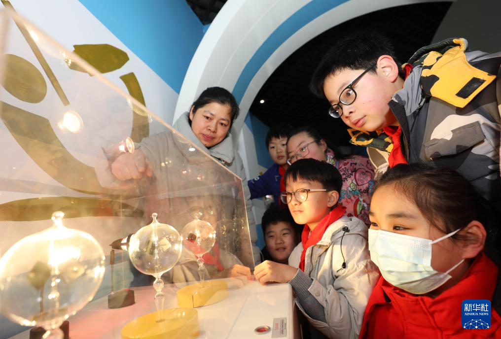 1月1日,在安徽省淮北市科技馆,孩子们在体验科普装置。