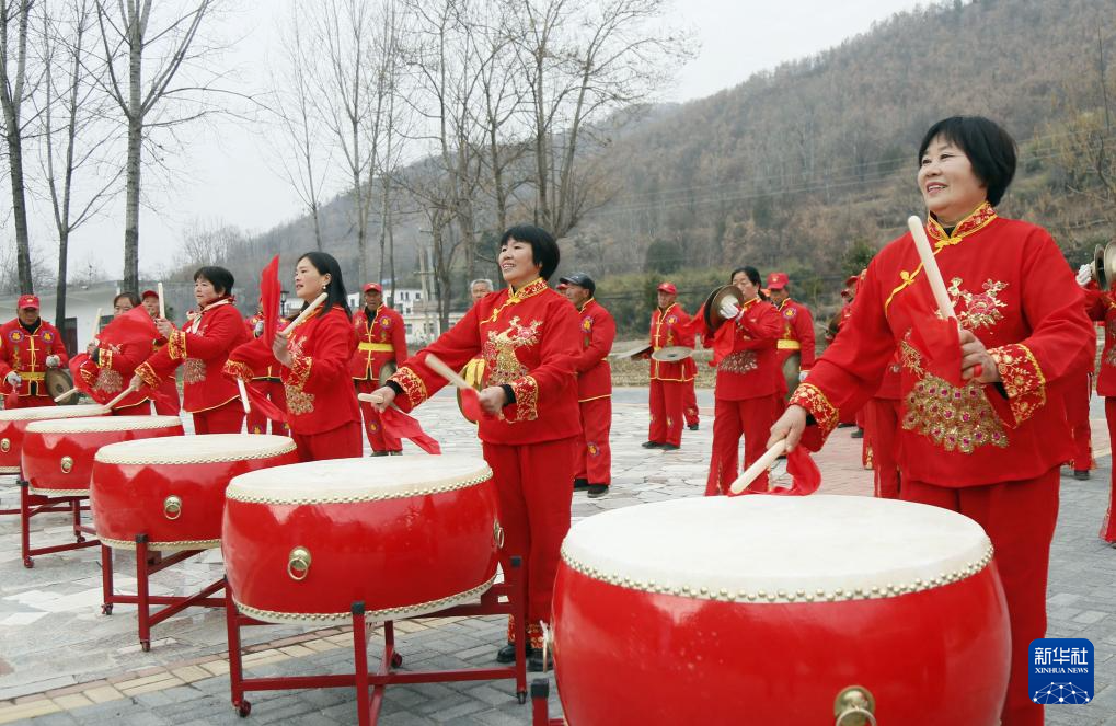 1月1日,河南省洛阳市汝阳县靳村乡太平村村民敲锣打鼓欢庆新年。