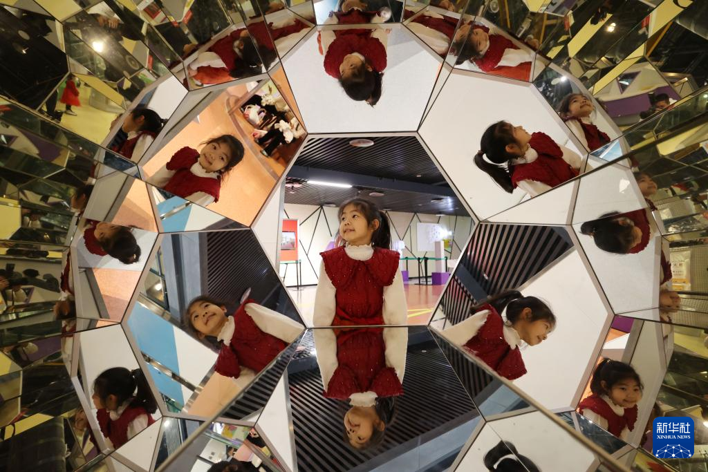 1月1日,一名小朋友在福建厦门科技馆内体验"钝角六面体镜"。