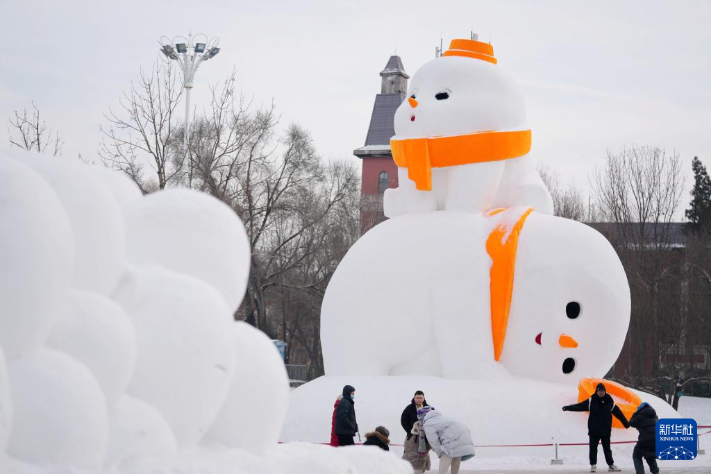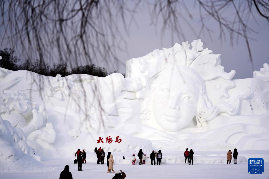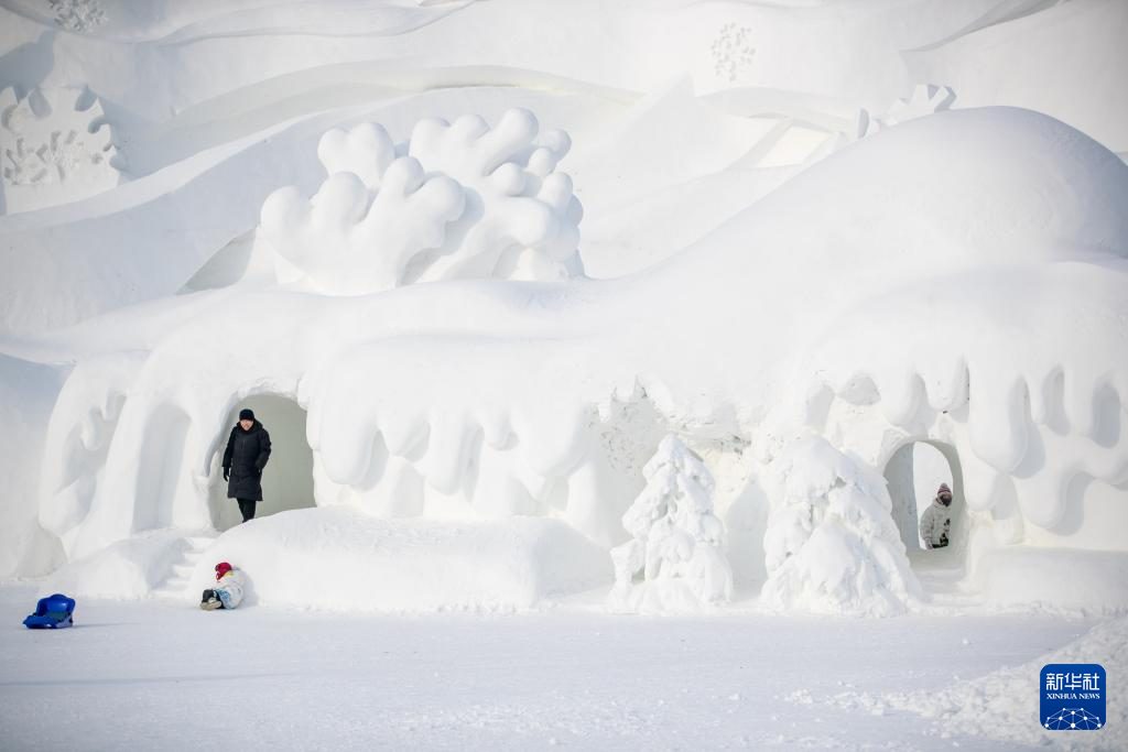 1月1日,游客在黑龙江哈尔滨太阳岛雪博会园区内游玩。