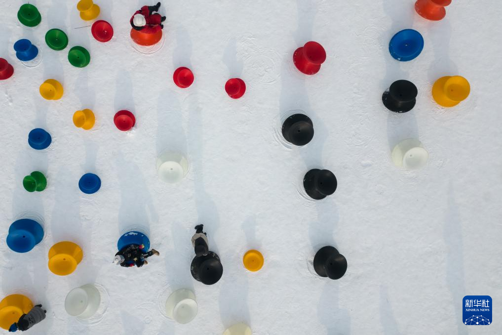 1月1日,游客在河北省武安市七步沟滑雪场滑雪(无人机照片)。