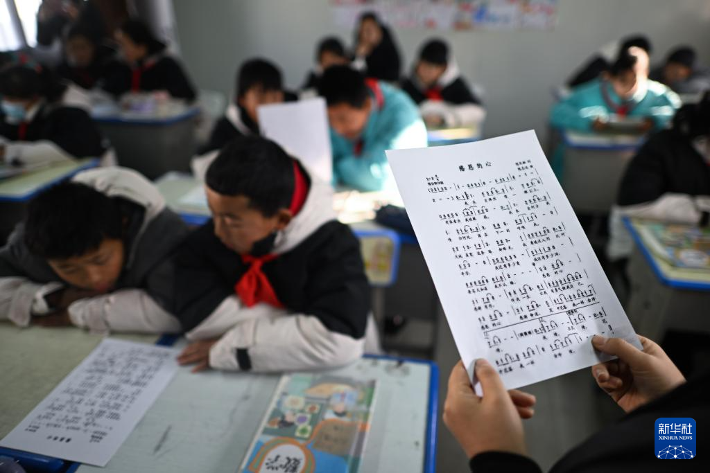 1月2日,青海省海东市民和回族土族自治县官亭镇中心学校的学生在上音乐课。