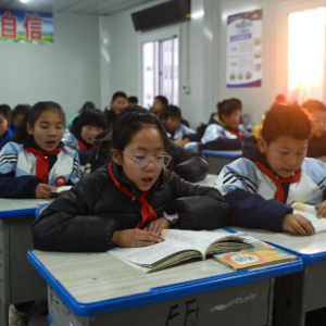 1月2日,青海省海东市民和回族土族自治县官亭镇中心学校的学生在上课前唱歌。